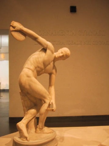 右:「ランチェロッティの円盤投げDiscobolo Lancellotti」(4世紀の模刻) ローマ国立美術館マッシモ宮(Museo Nazionale Rpmano palazzo massimo)所蔵−写真では茶色に写ってしまったが、実物は白の美しい大理石像である。2001年3月8日撮影